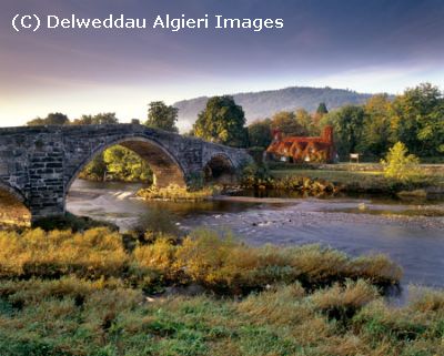 National Trust Tu Hwnt i'r Bont tea rooms and the bridge at Llanrwst taken Autumn 2008 early morning. Conwy Valley. North Wales