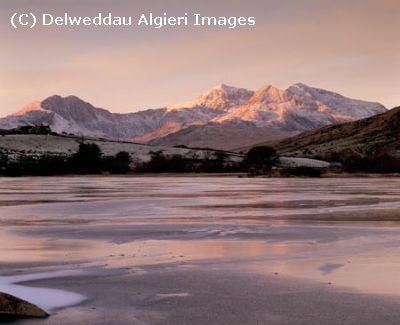 Taken at sunrise, the Snowdon Horseshoe and Llynnau Mymbyr, Dyffryn Mymbyr, Snowdonia National Park, mountains of North Wales