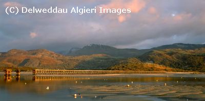 Evening light over Mawddach estuary and cambrian coast railway cader idris in background south gwynedd snowdonia national park