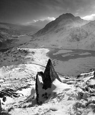 Taken from Y Garn February 2003. Snowdonia National Park. mountains of north wales. mountain scenery, llyn idwal, llyn ogwen, carneddau. black & white